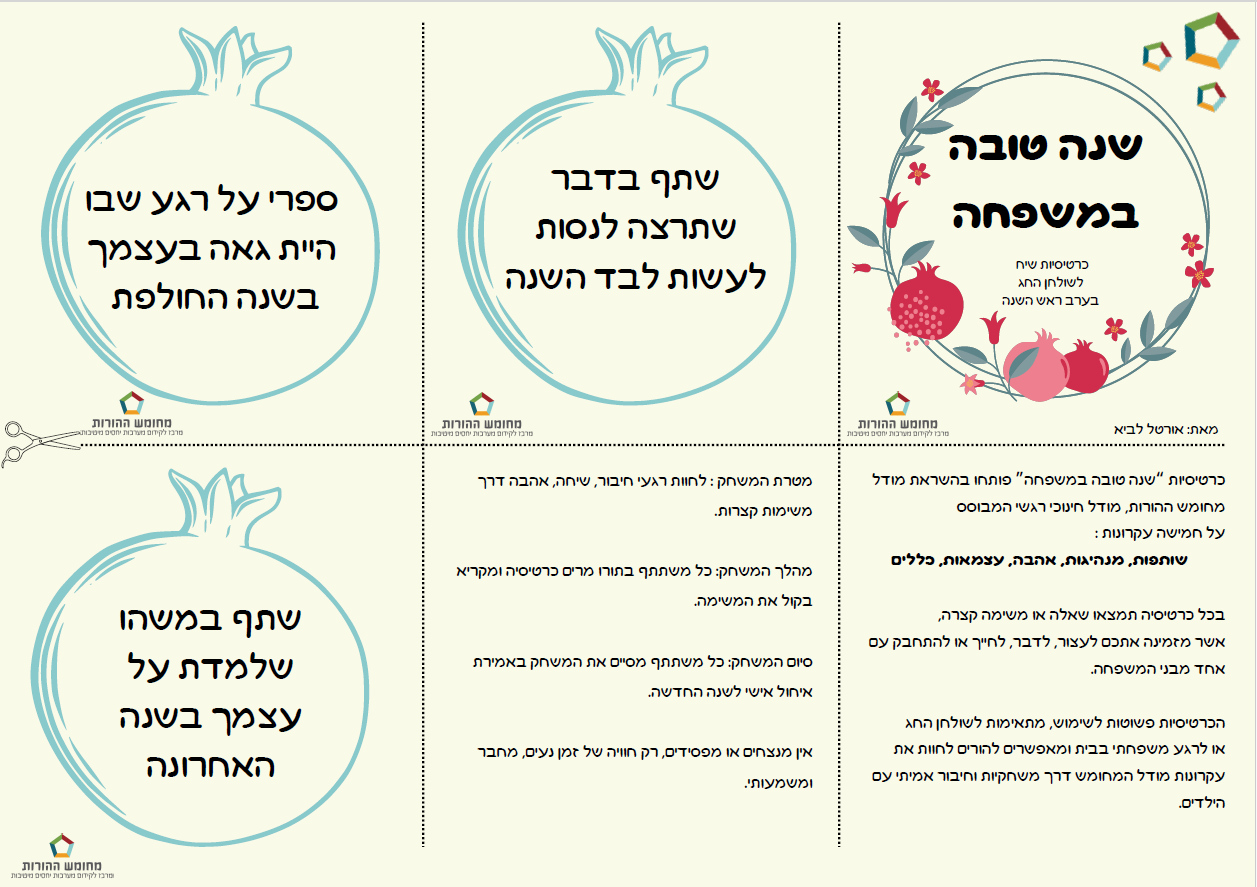 הכרטיסיות פשוטות לשימוש, מתאימות לשולחן החג או לרגע משפחתי בבית ומאפשרים להורים לחוות את עקרונות מודל המחומש דרך משחקיות וחיבור אמיתי עם הילדים.